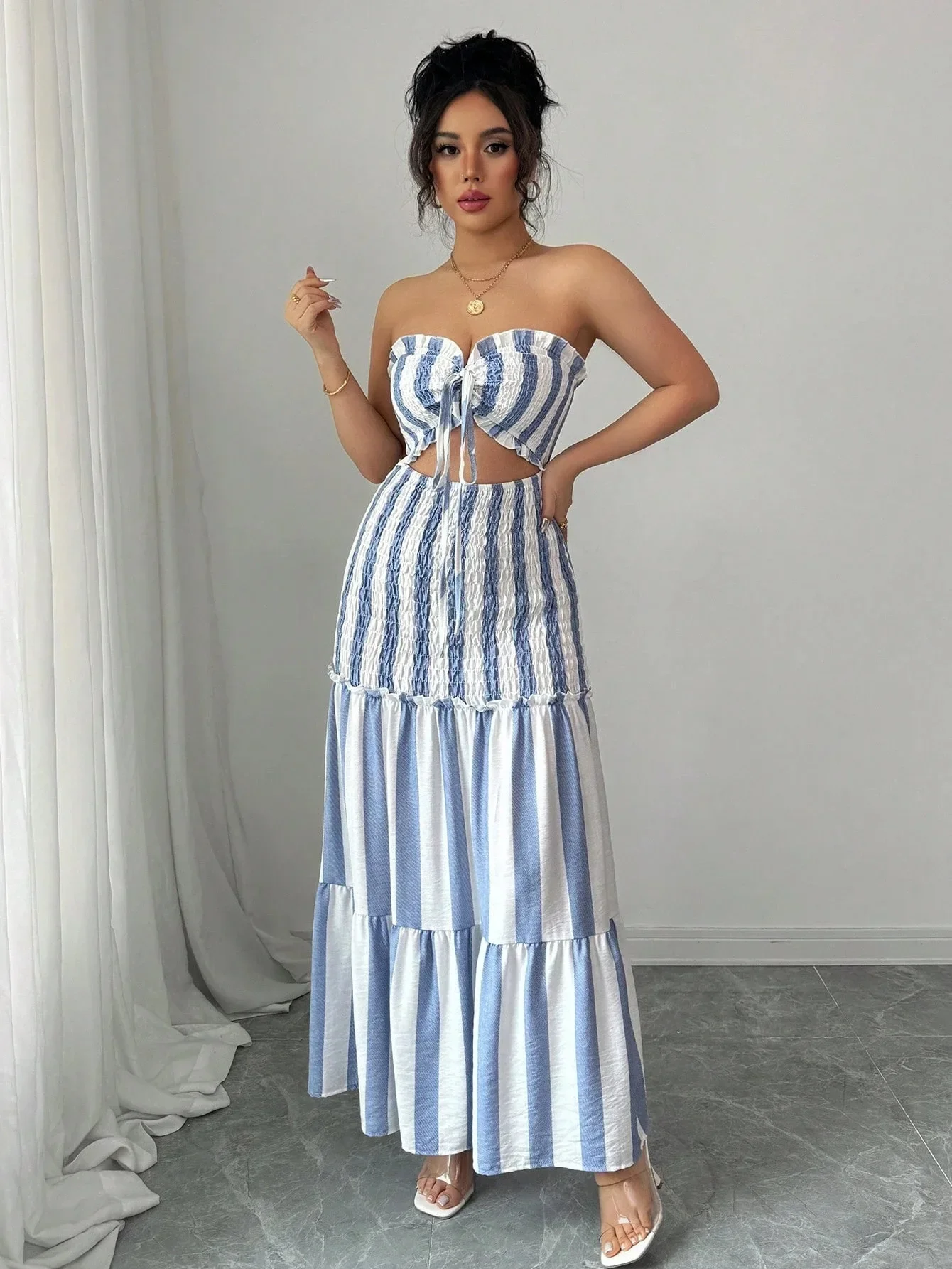 Transforme qualquer momento em uma ocasião especial com o Vestido Longo Striped Elegance.